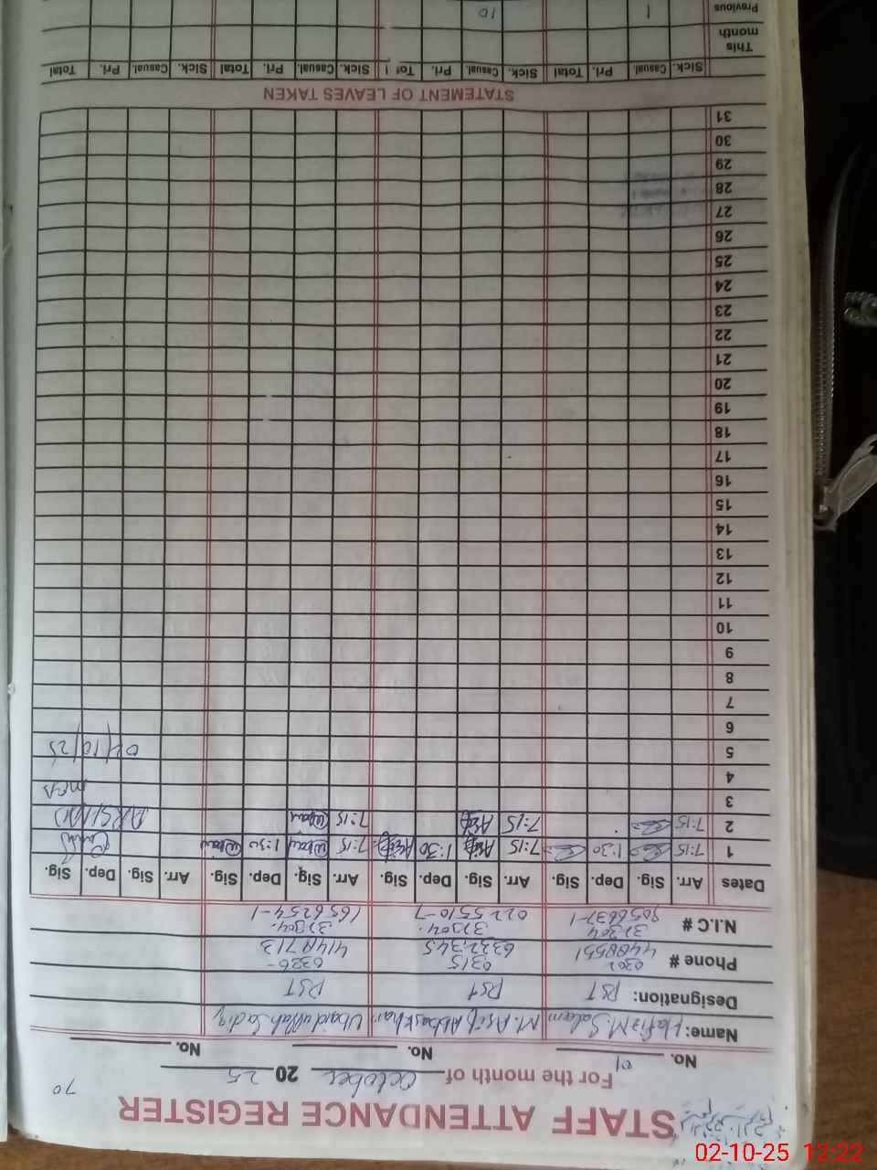 | CNIC | Full Name | Designation | R/C | Absence during last cal. month |