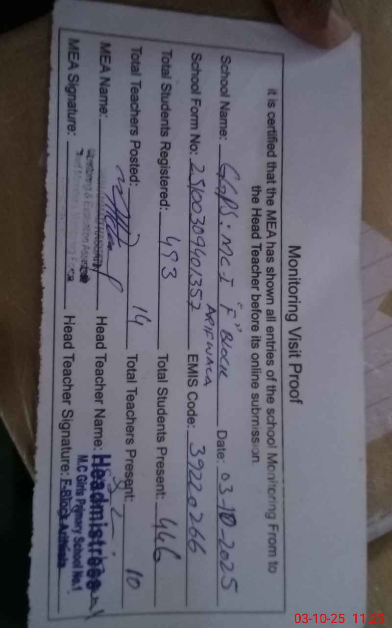 | EMIS Code: 39220266 | Name of School: GGPS MC NO. 1 F BLOCK ARIF WALA | |||