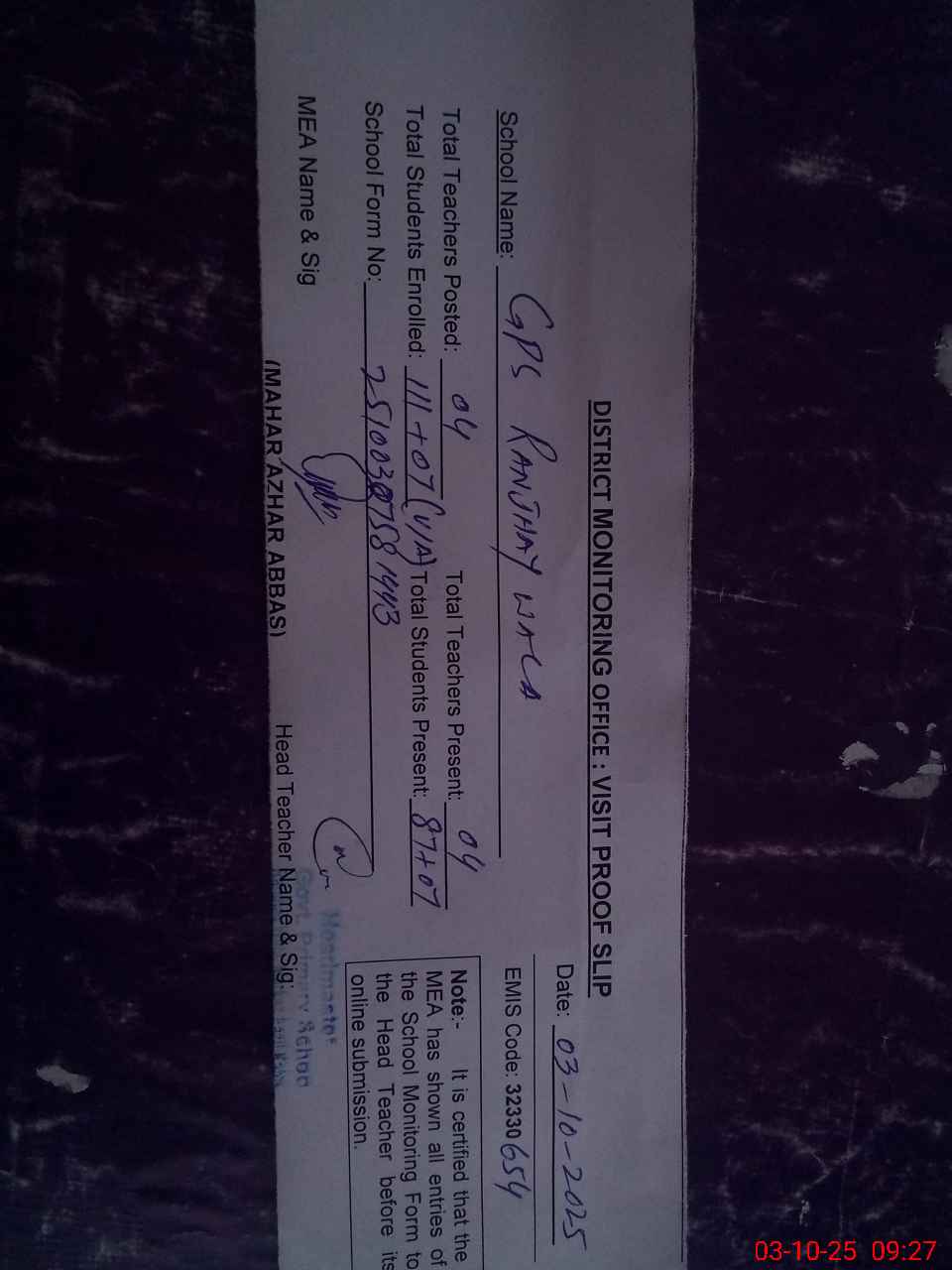 | EMIS Code: 32330654 | Name of School: GPS RANJHAY WALA | |||