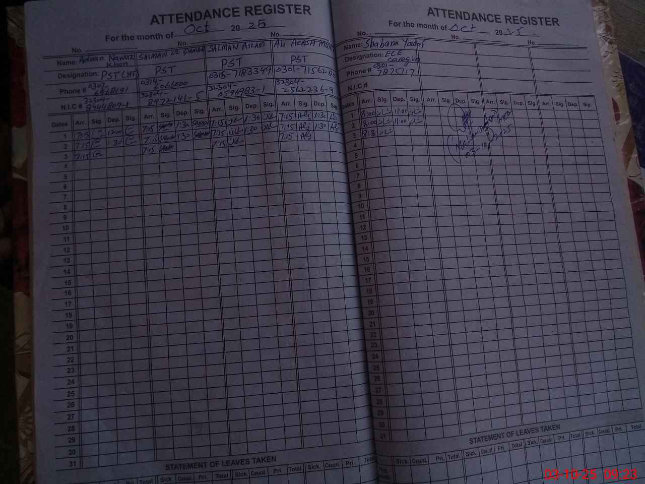 | CNIC | Full Name | Designation | R/C | Absence During Last Calender Month |