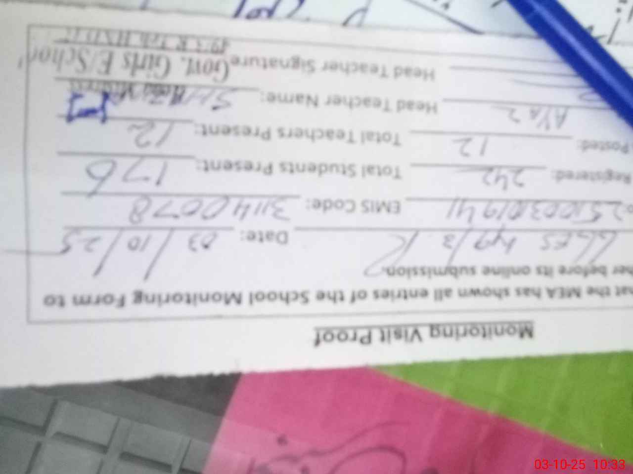 | Attendance Register | Head Teacher | MEA with School | Visit Proof |