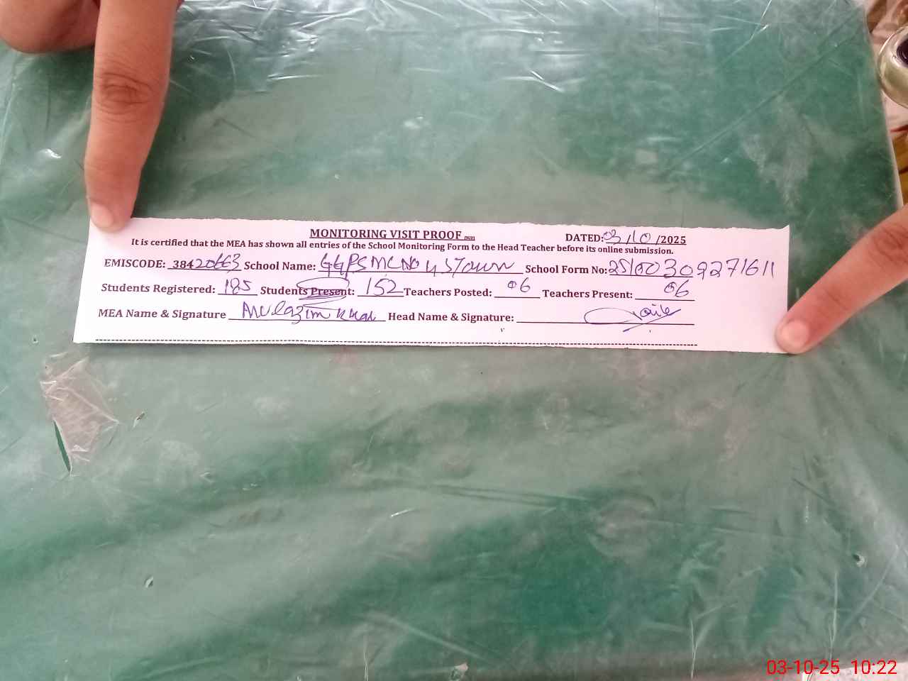 | Monitoring Date: 03-10-2025 | Start Time: 03-10-2025 09:27 AM | End Time: 03-10-2025 10:22 AM | Name of MEA: MU**** KH**** | |