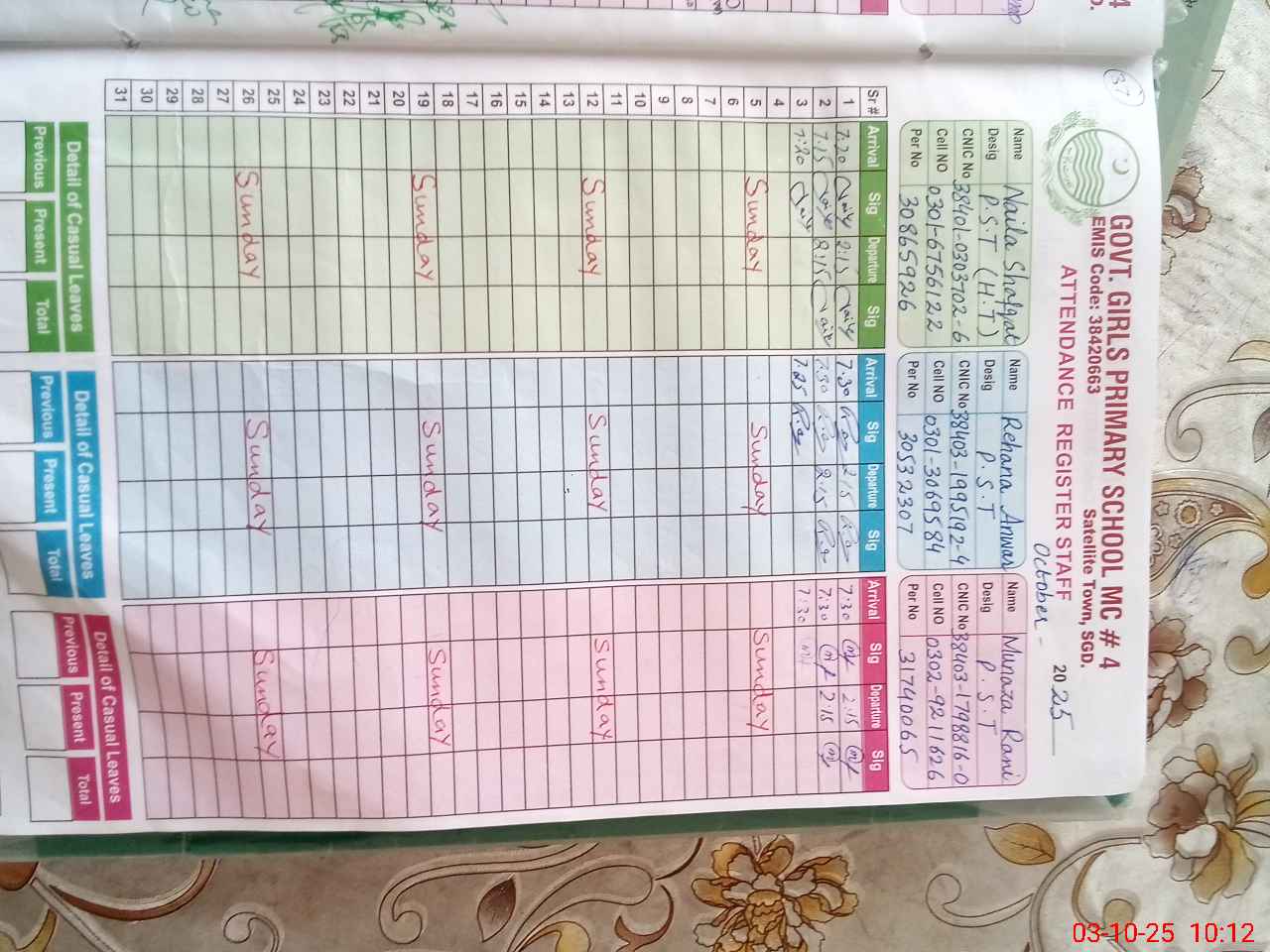 | CNIC | Full Name | Designation | R/C | Absence During Last Calender Month |