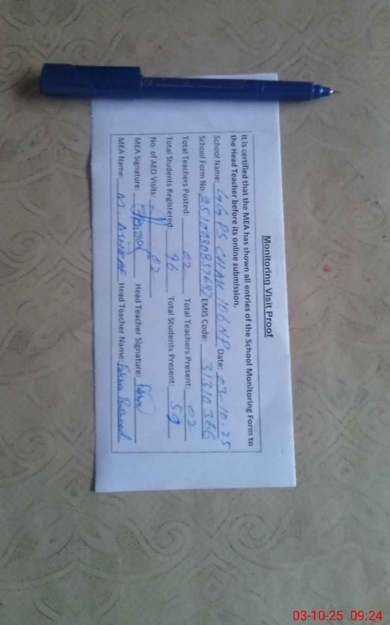 | Attendance Register | Head Teacher | MEA with School | Visit Proof |