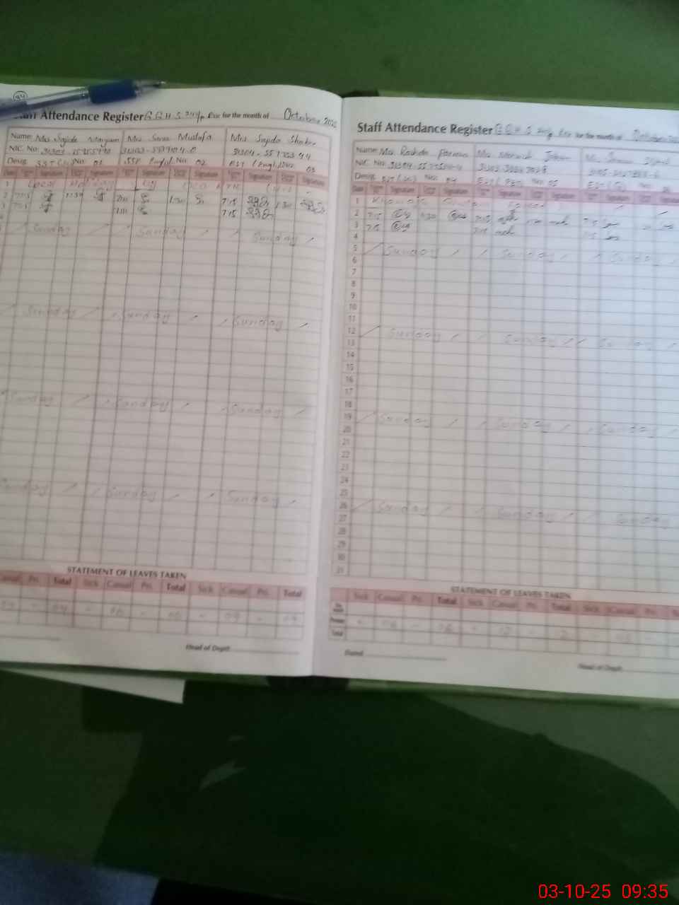 | CNIC | Full Name | Designation | R/C | Absence During Last Calender Month |