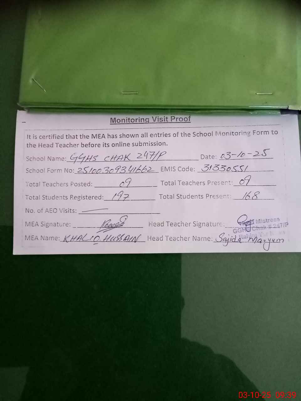 | Attendance Register | Head Teacher | MEA with School | Visit Proof |