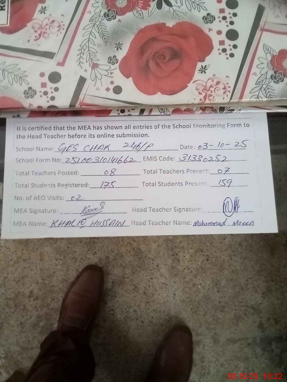 | Certified that this School was Inspected by the Undersigned MEA/DMO Today and the Information Stated Above is as Per Record. | |||||