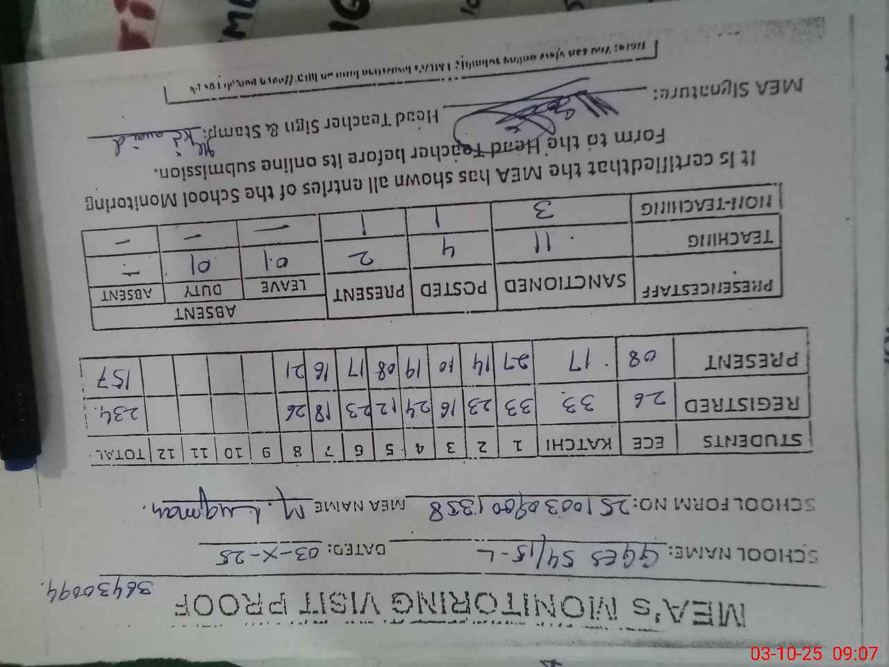 | Attendance Register | Head Teacher | MEA with School | Visit Proof |