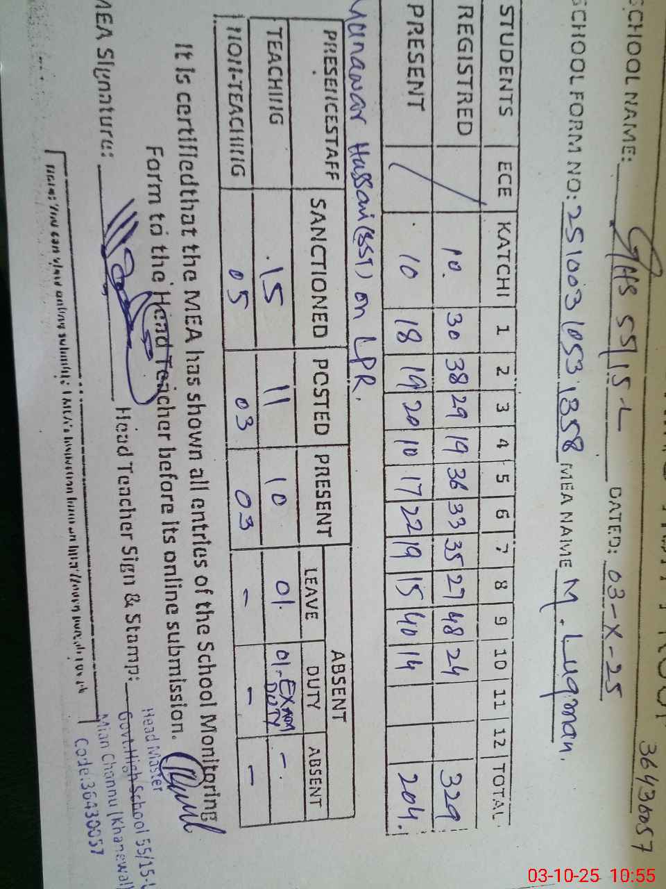 | Certified that this School was Inspected by the Undersigned MEA/DMO Today and the Information Stated Above is as Per Record. | |||||