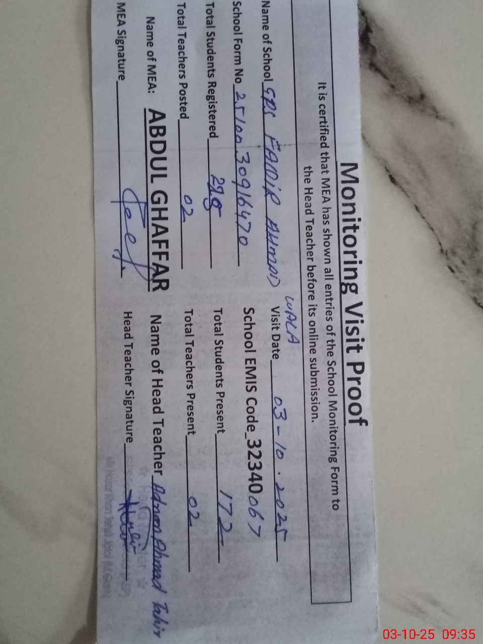 | EMIS Code: 32340067 | Name of School: GPS FAQIR AHMAD WALA | |||