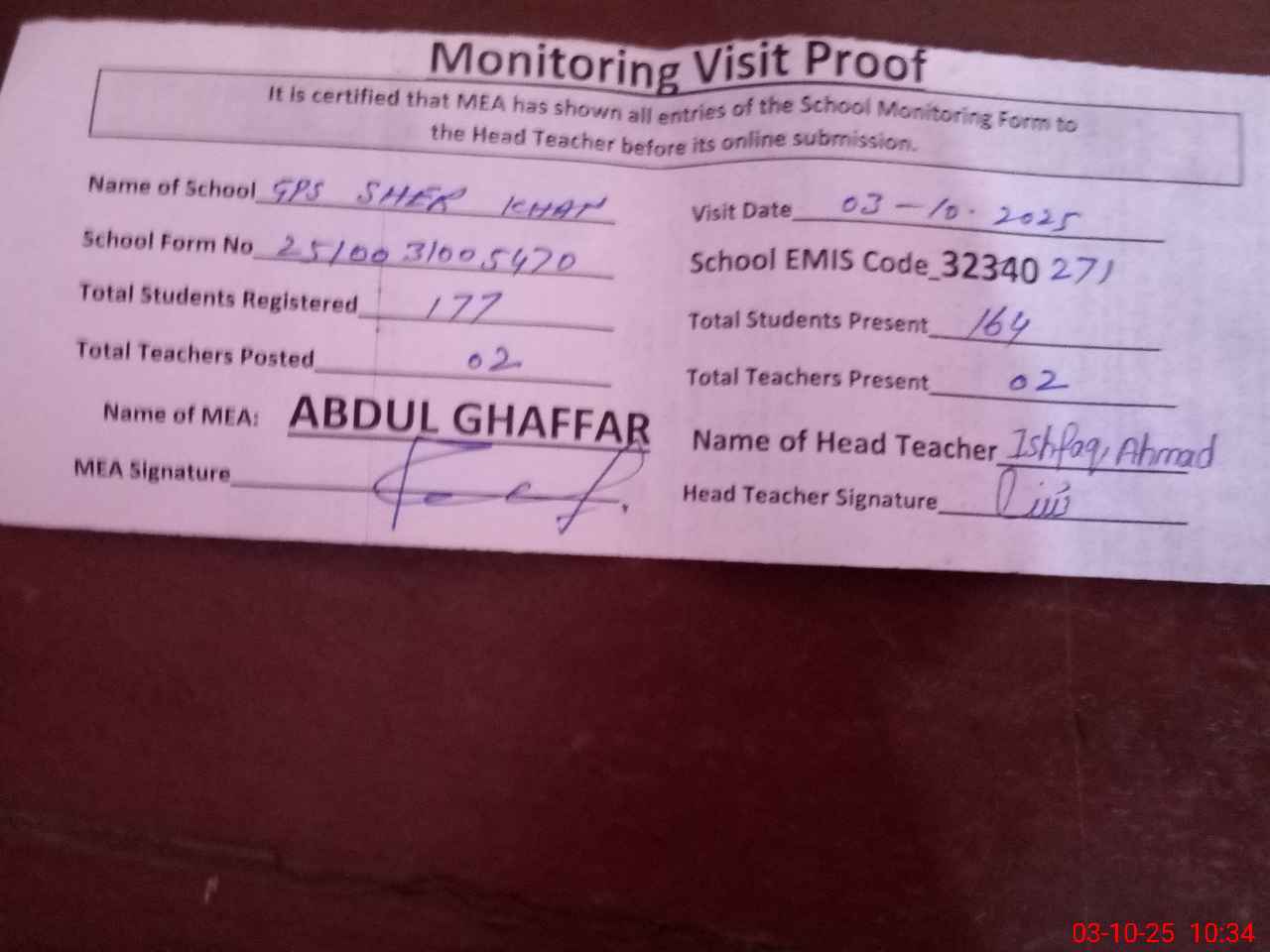 | EMIS Code: 32340271 | Name of School: GPS SHER KHAN | |||