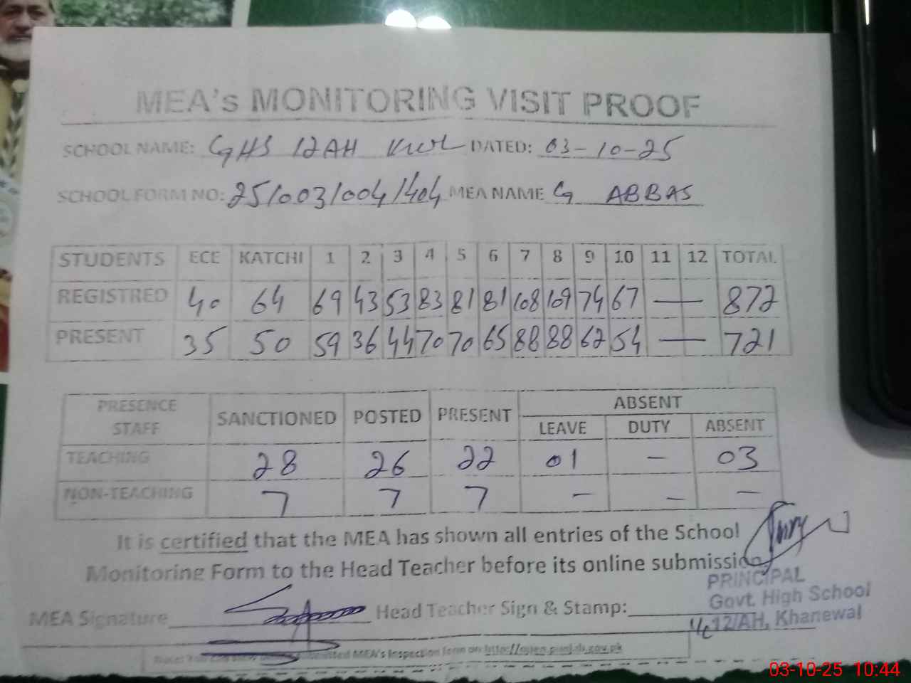 | Attendance Register | Head Teacher | MEA with School | Visit Proof |