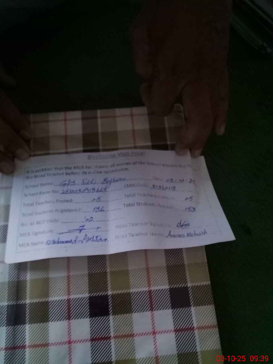 | Attendance Register | Head Teacher | MEA with School | Visit Proof |