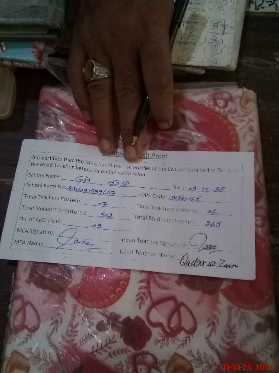 | Certified that this School was Inspected by the Undersigned MEA/DMO Today and the Information Stated Above is as Per Record. | |||||