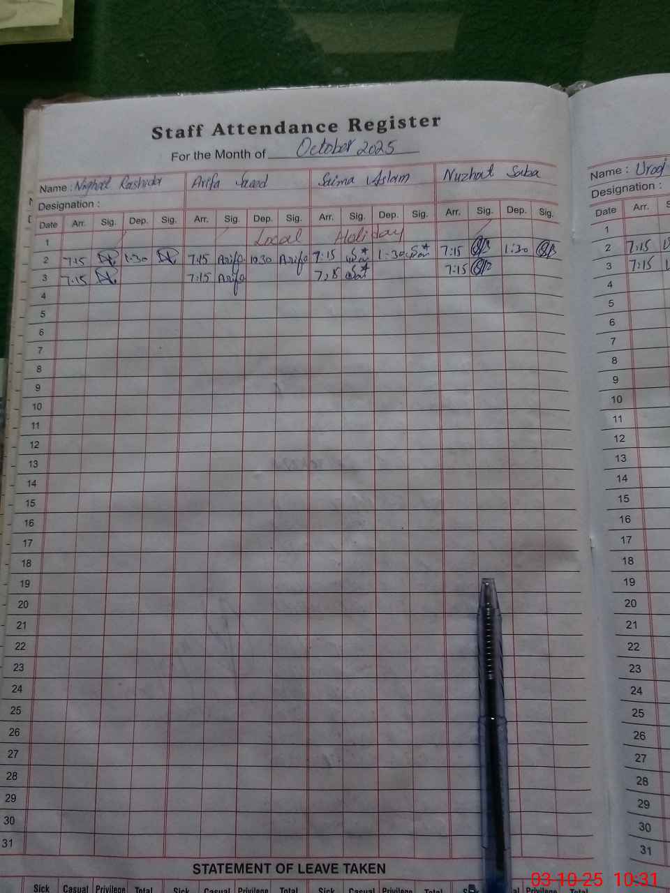 | No. of Students Present - Female | 42 | 0 | 23 | 37 | 31 | 32 | 36 | 38 | 47 | 71 | 52 | 409 | ||||