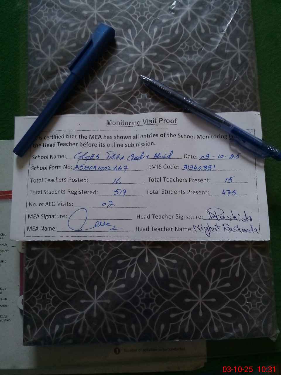 | Certified that this School was Inspected by the Undersigned MEA/DMO Today and the Information Stated Above is as Per Record. | |||||
