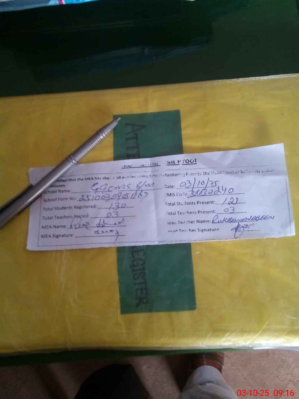 | Attendance Register | Head Teacher | MEA with School | Visit Proof |