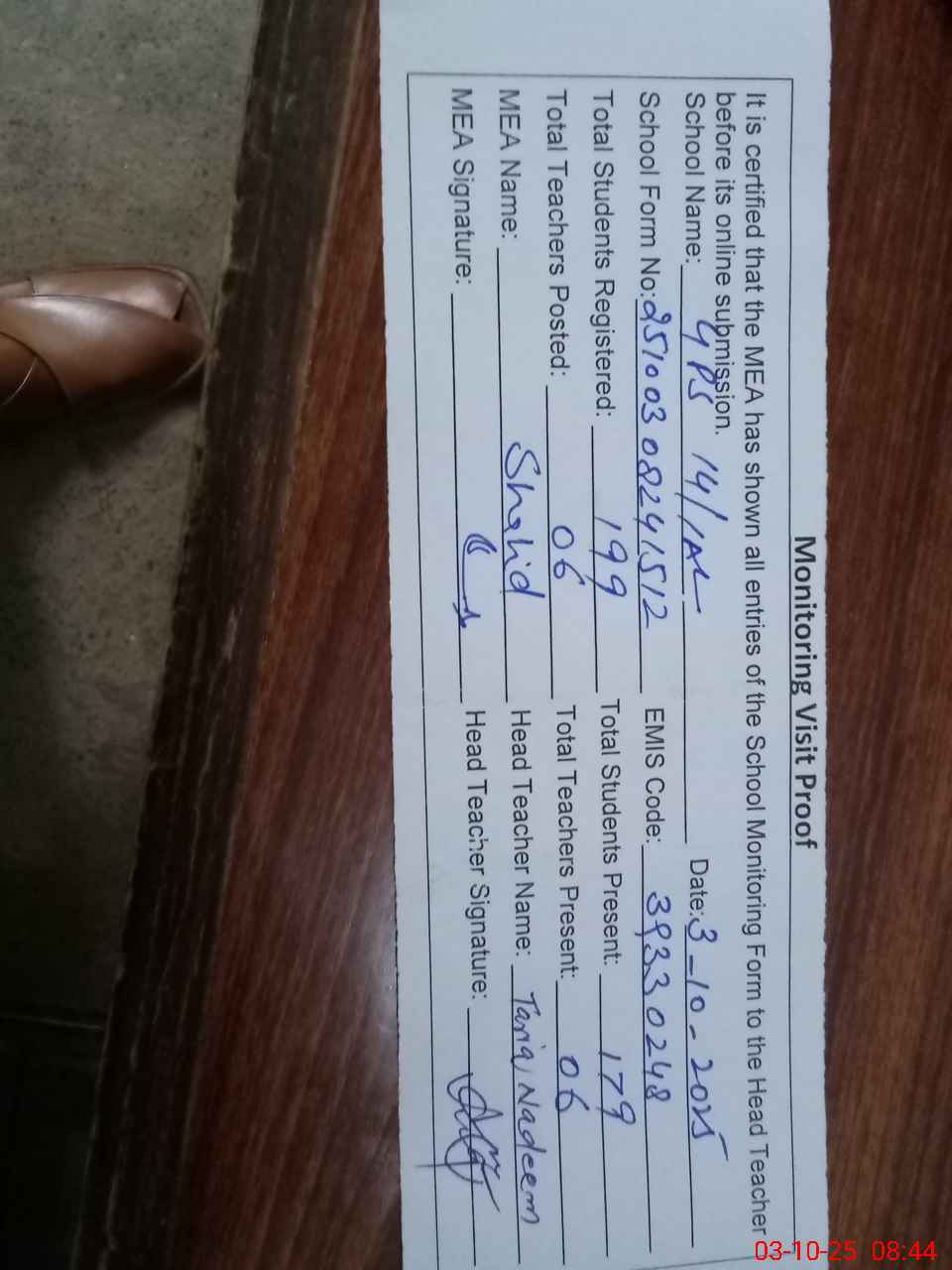 | Certified that this School was Inspected by the Undersigned MEA/DMO Today and the Information Stated Above is as Per Record. | |||||