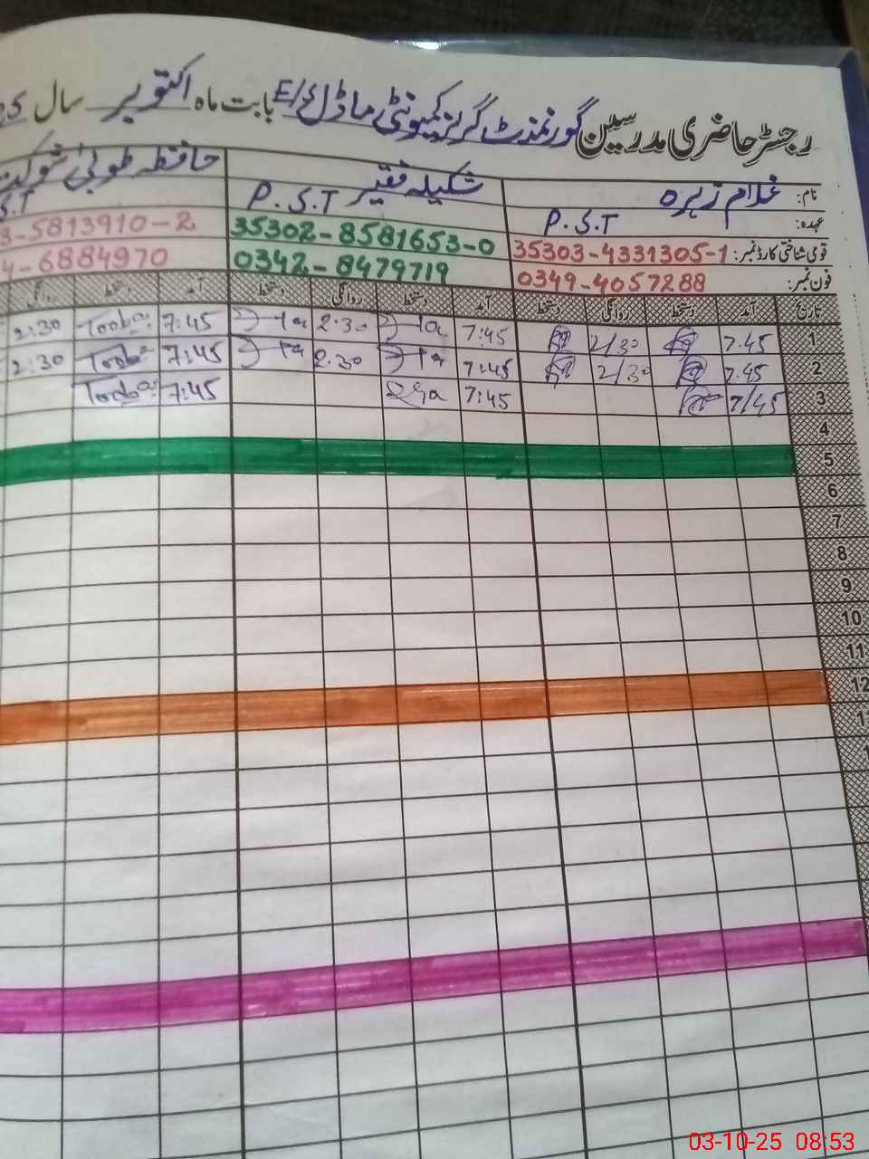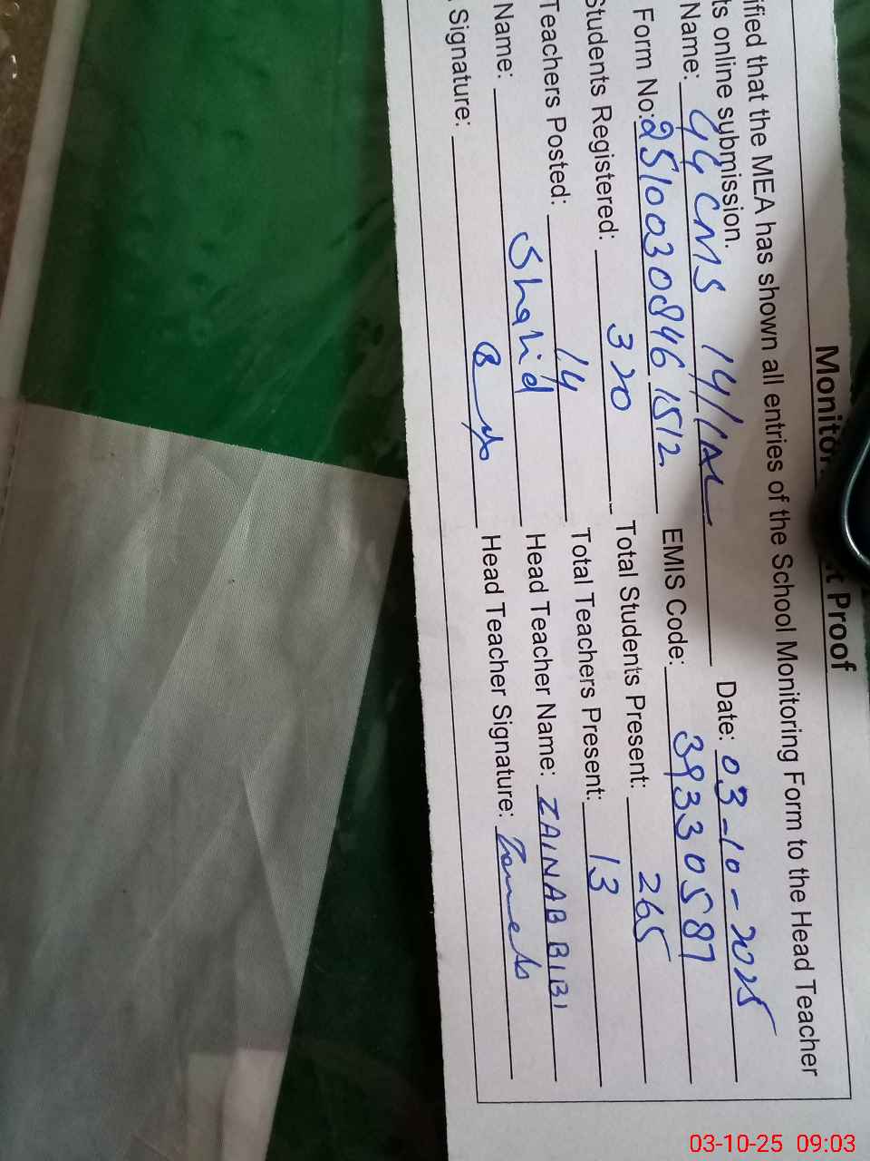 | Name: ZA**** BI**** Designation: (School Headmaster's/Headmistress's) S.S.T GENERAL Phone/Cell Number: 03**** |