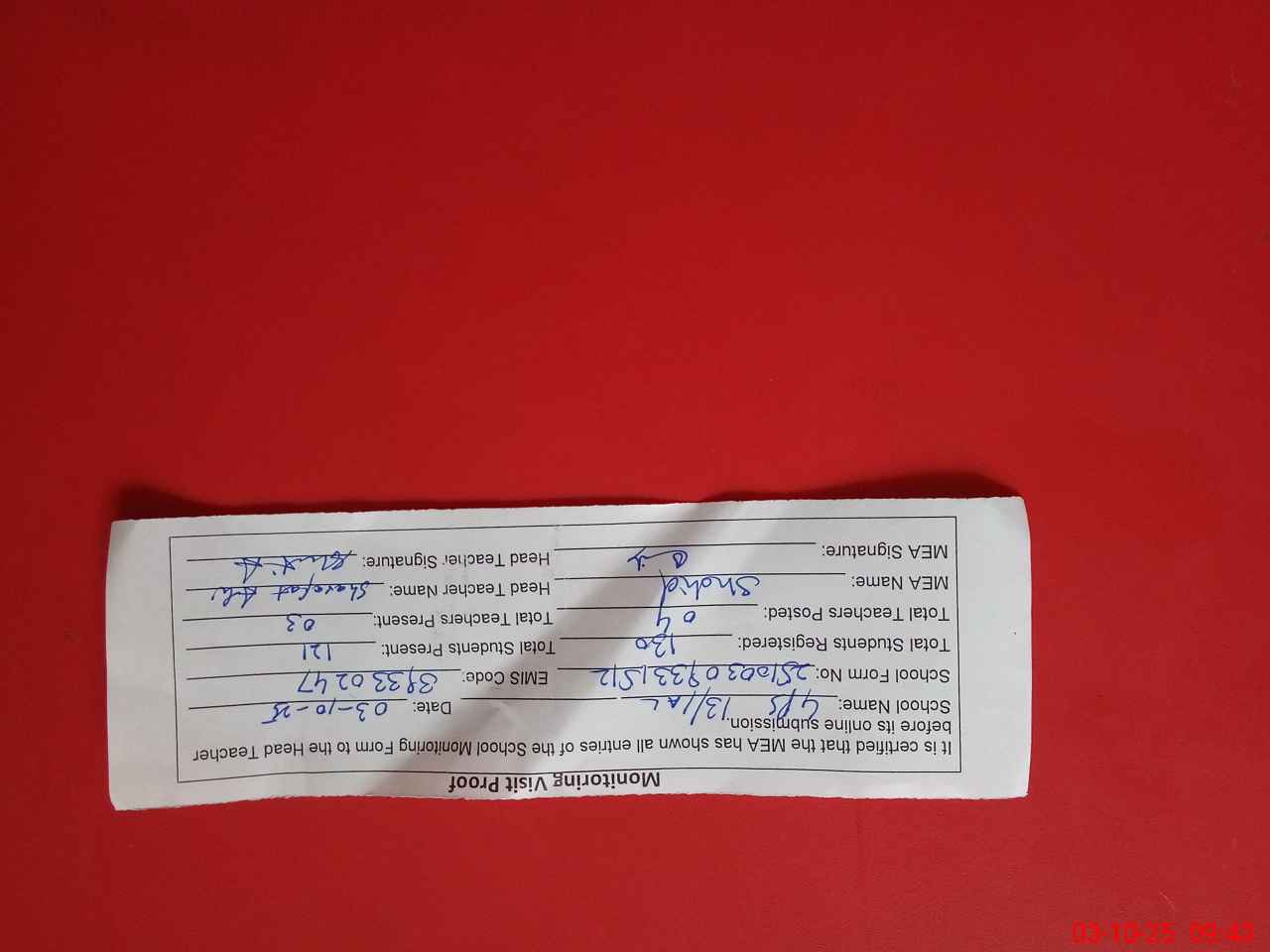 | Attendance Register | Head Teacher | MEA with School | Visit Proof |
