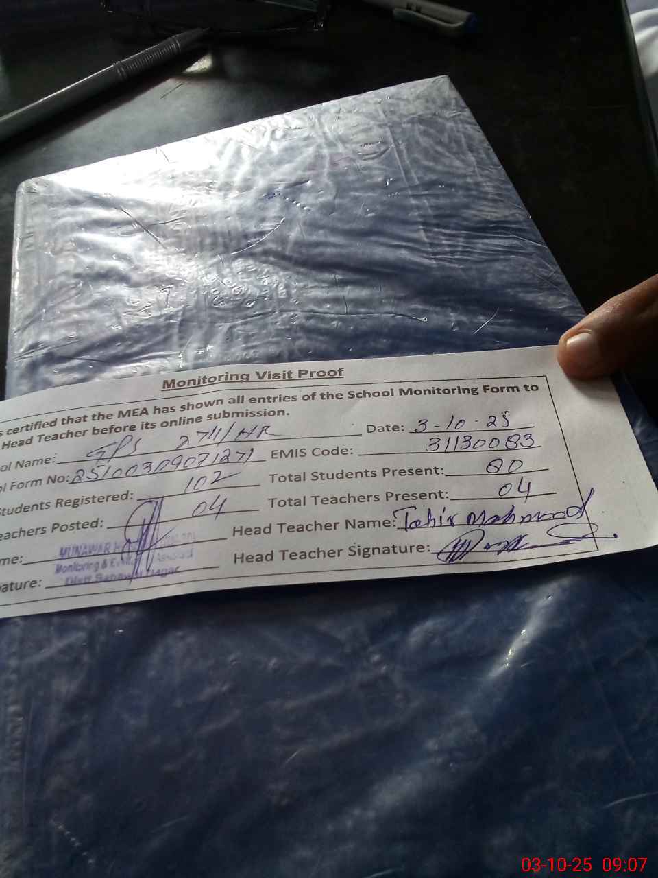| Attendance Register | Head Teacher | MEA with School | Visit Proof |