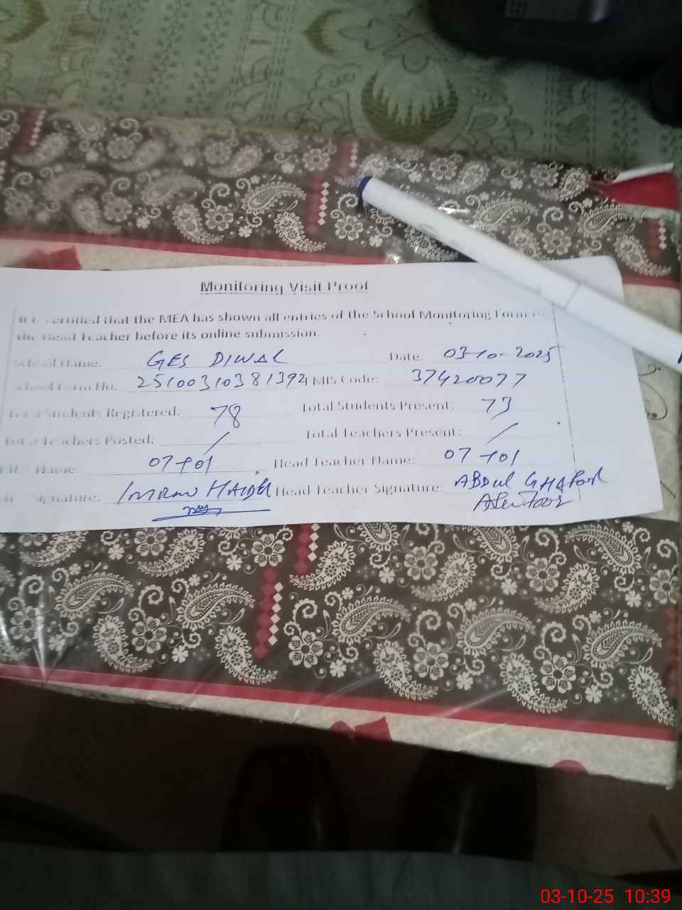 | Attendance Register | Head Teacher | MEA with School | Visit Proof |