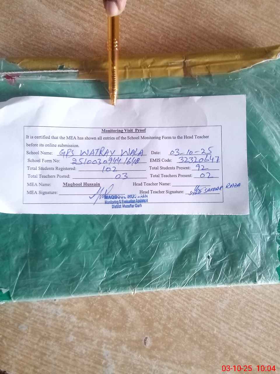 | EMIS Code: 32320647 | Name of School: GPS WATRAY WALA | |||