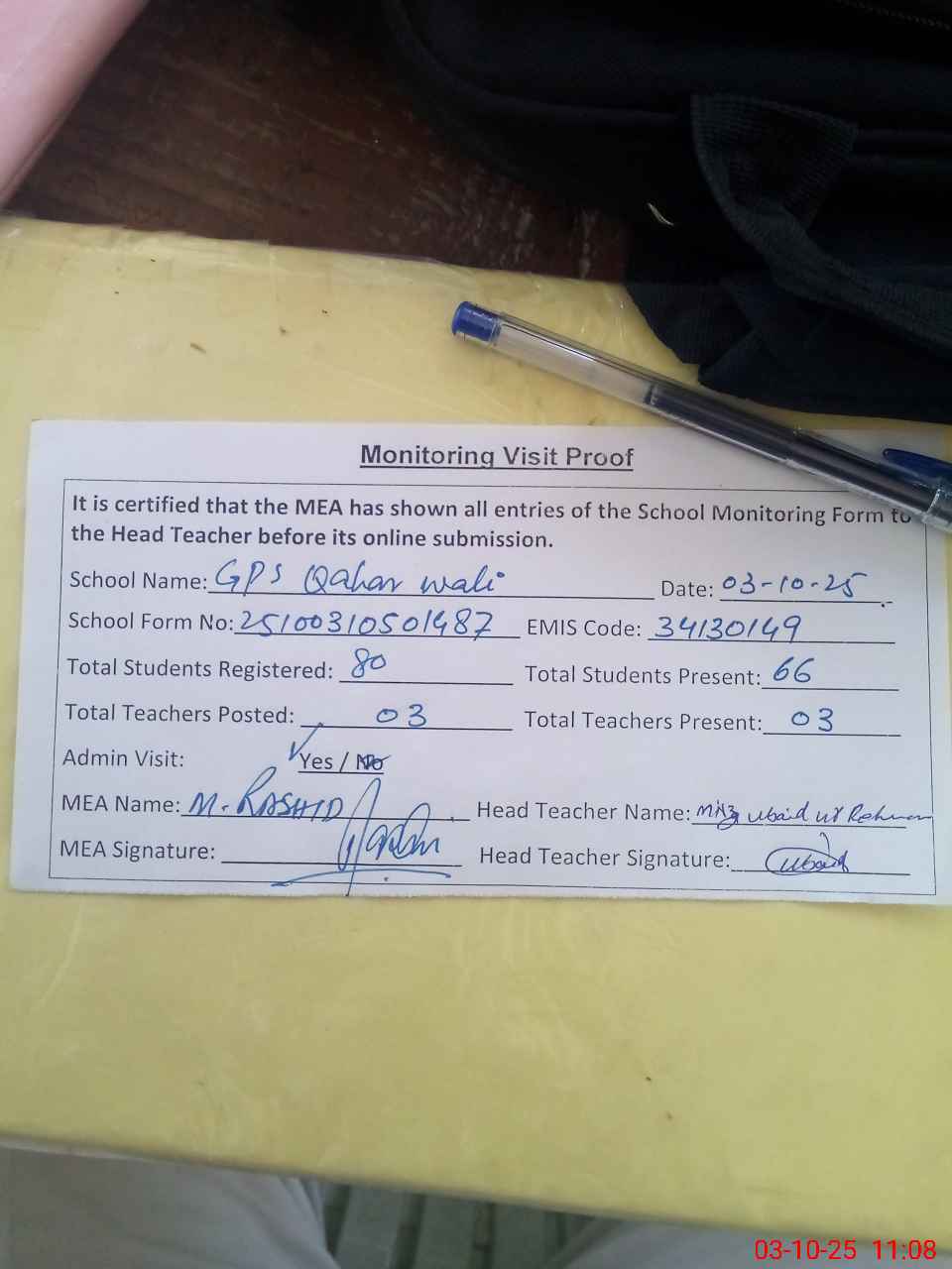 | EMIS Code: 34130149 | Name of School: GPS QAHAR WALI | |||