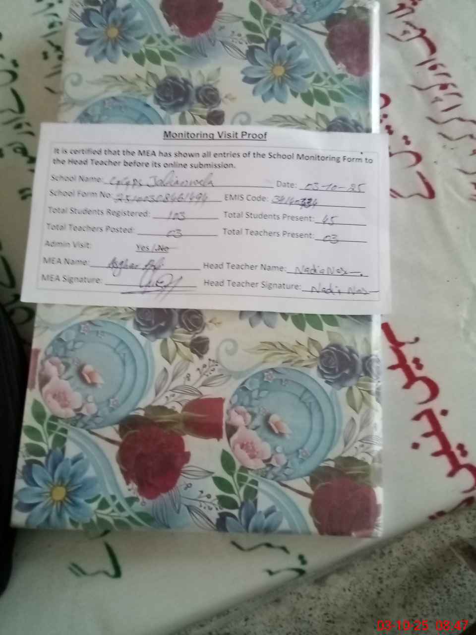| Attendance Register | Head Teacher | MEA with School | Visit Proof |