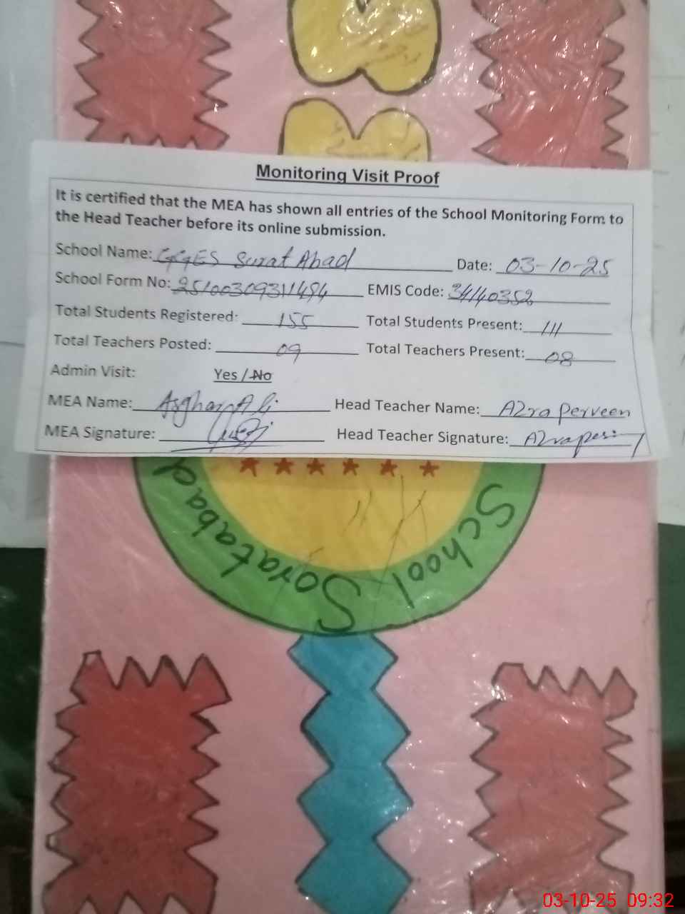 | Attendance Register | Head Teacher | MEA with School | Visit Proof |