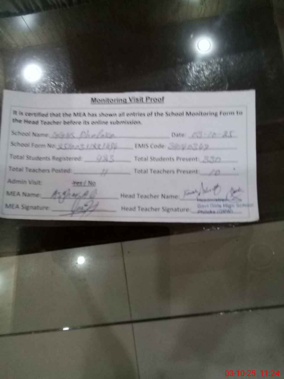 | Certified that this School was Inspected by the Undersigned MEA/DMO Today and the Information Stated Above is as Per Record. | |||||