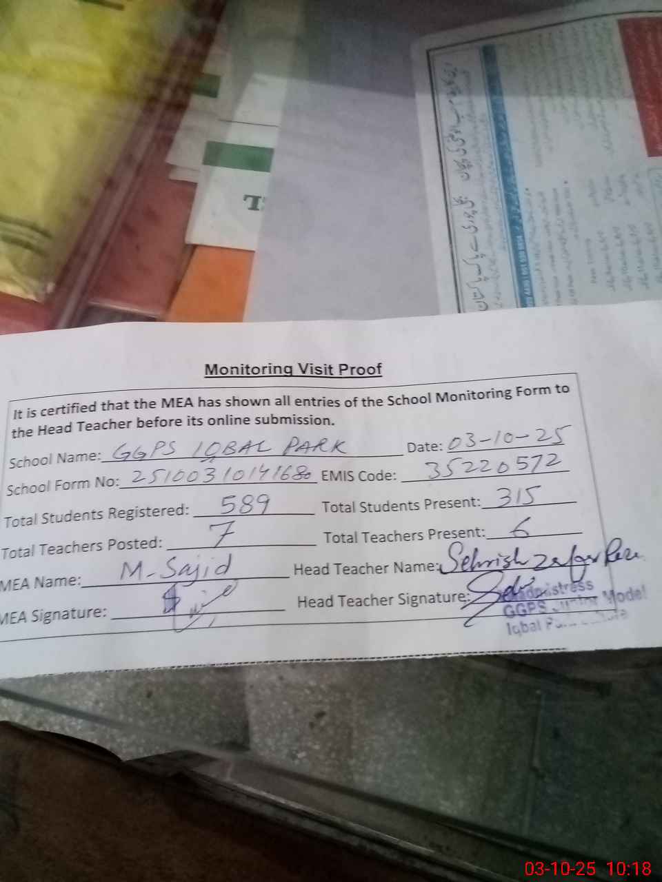 | EMIS Code: 35220572 | Name of School: GGPS JUNIOR MODEL IQBAL PARK | |||