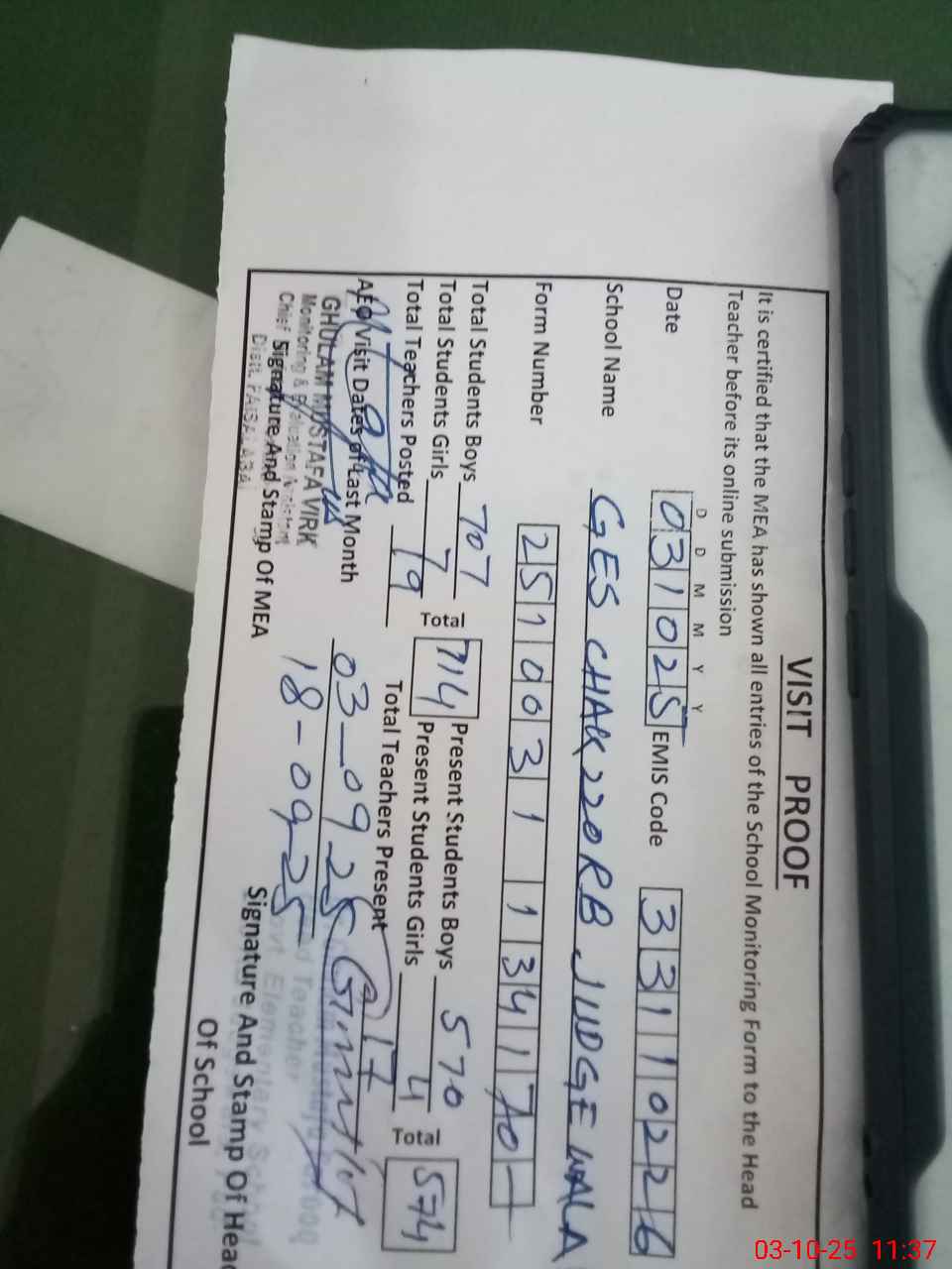 | Name: GH**** MU**** Designation: (School Headmaster's/Headmistress's) SST Phone/Cell Number: 03**** |