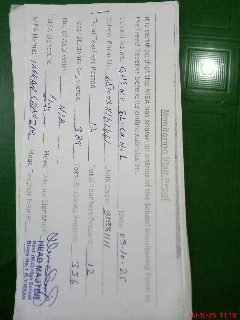 | EMIS Code: 31331111 | Name of School: GHS MC BLOCK NO. 1 | |||