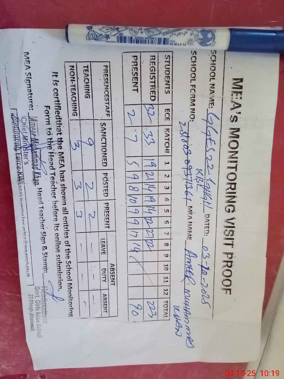 | Attendance Register | Head Teacher | MEA with School | Visit Proof |