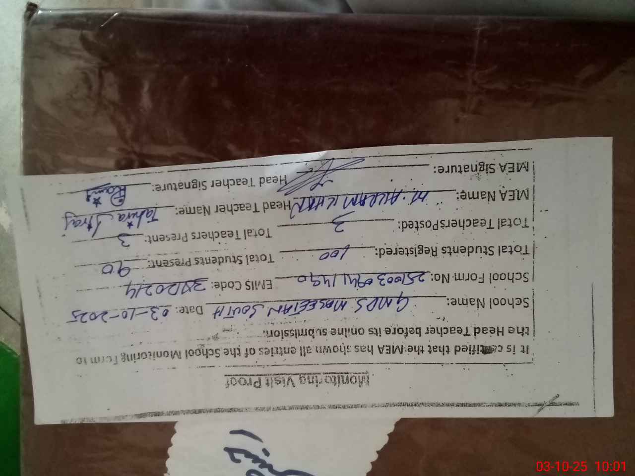 | Attendance Register | Head Teacher | MEA with School | Visit Proof |