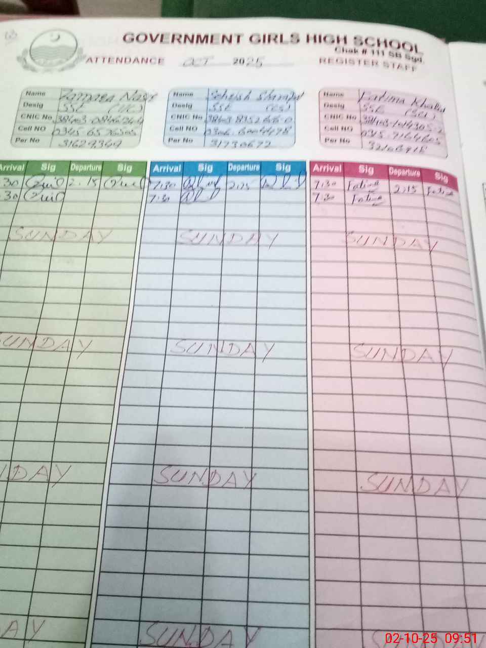 | CNIC | Full Name | Designation | R/C | Absence during last cal. month |
