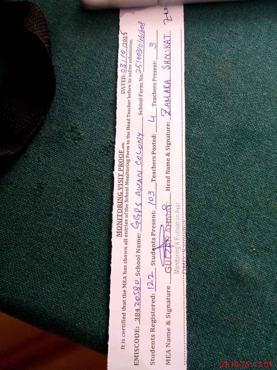 | EMIS Code: 38420580 | Name of School: GGPS AWAN COLONY | |||