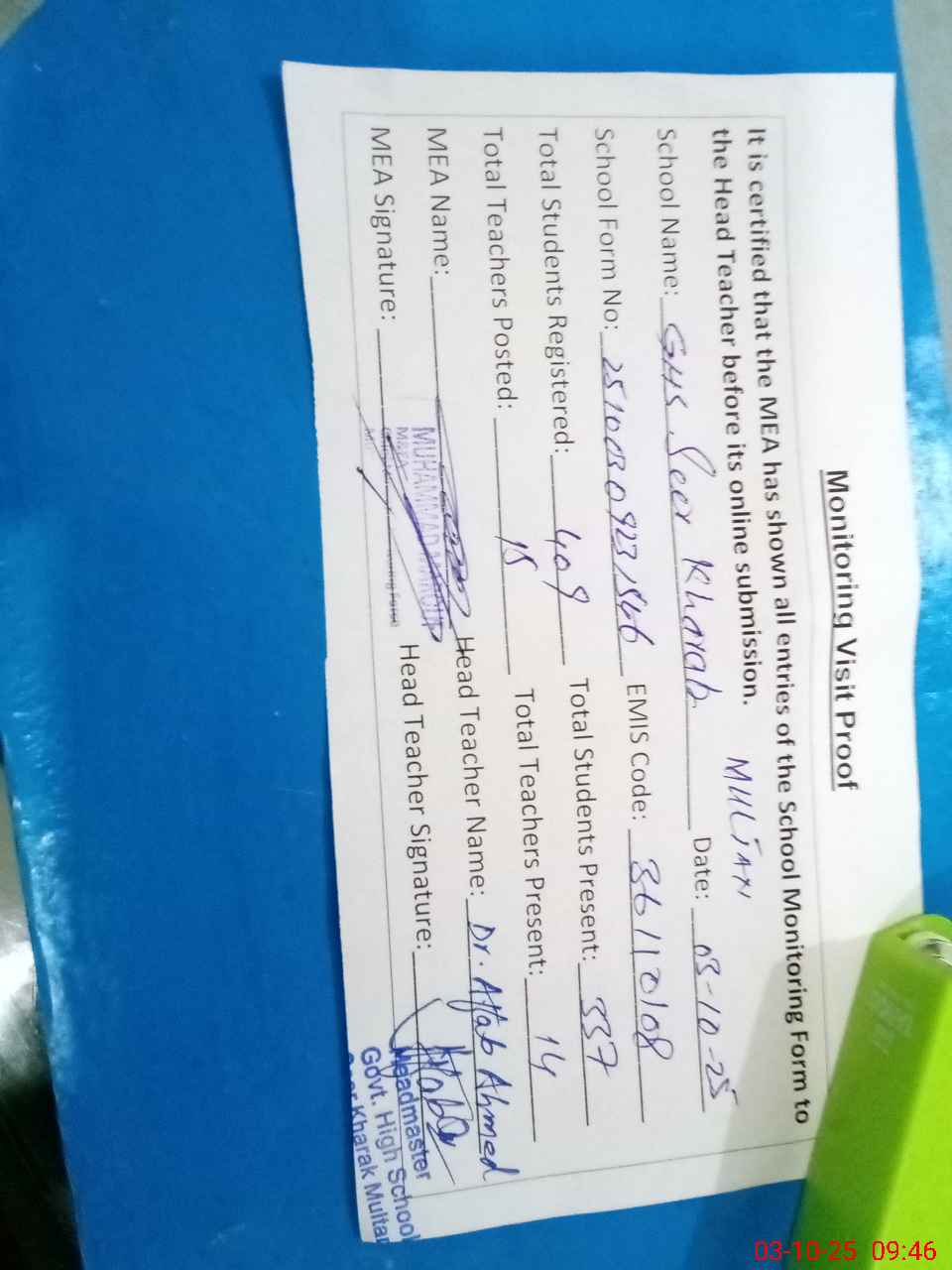 | Certified that this School was Inspected by the Undersigned MEA/DMO Today and the Information Stated Above is as Per Record. | |||||
