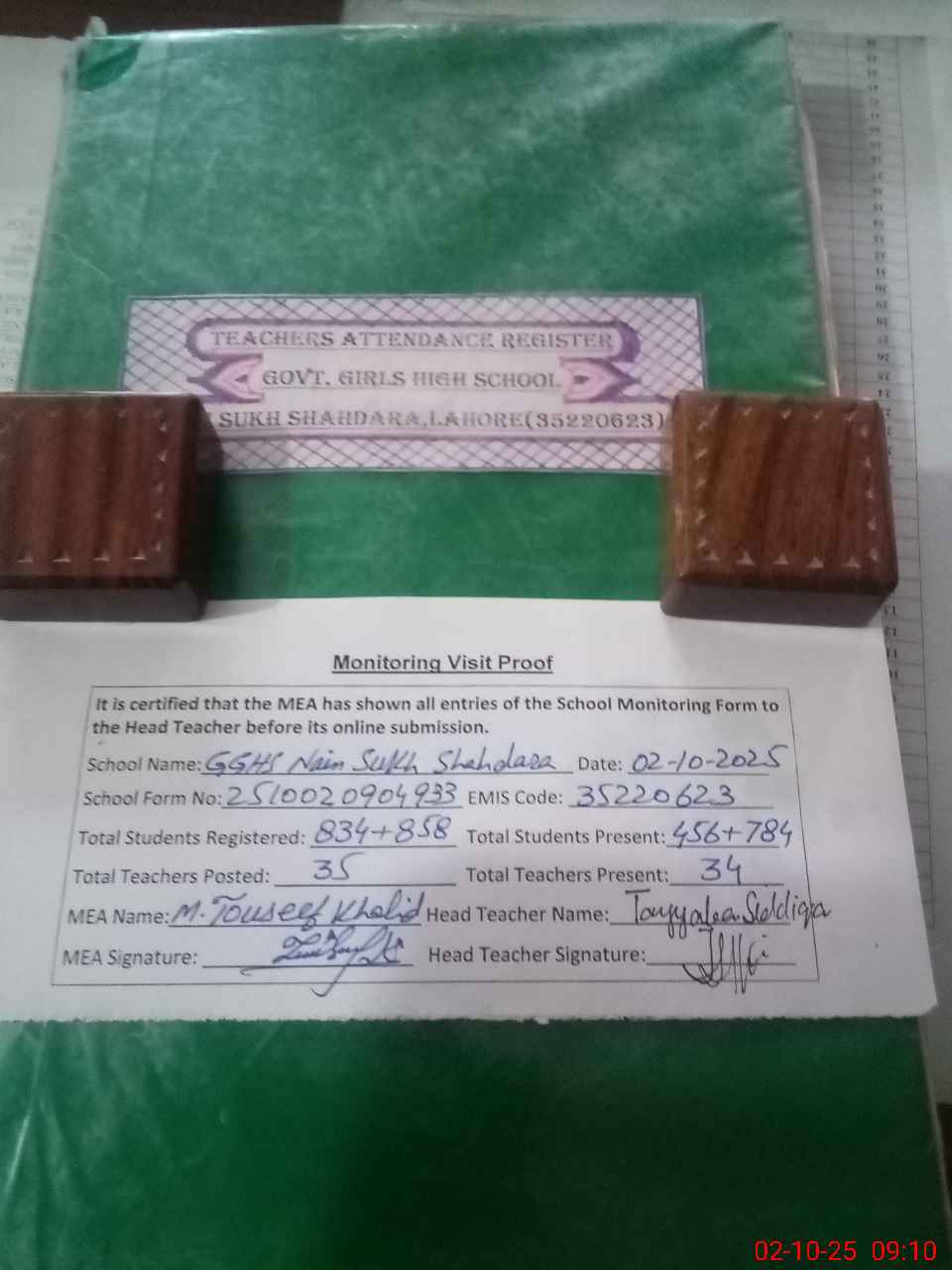 | Attendance Register | Head Teacher | MEA with School | Visit Proof |