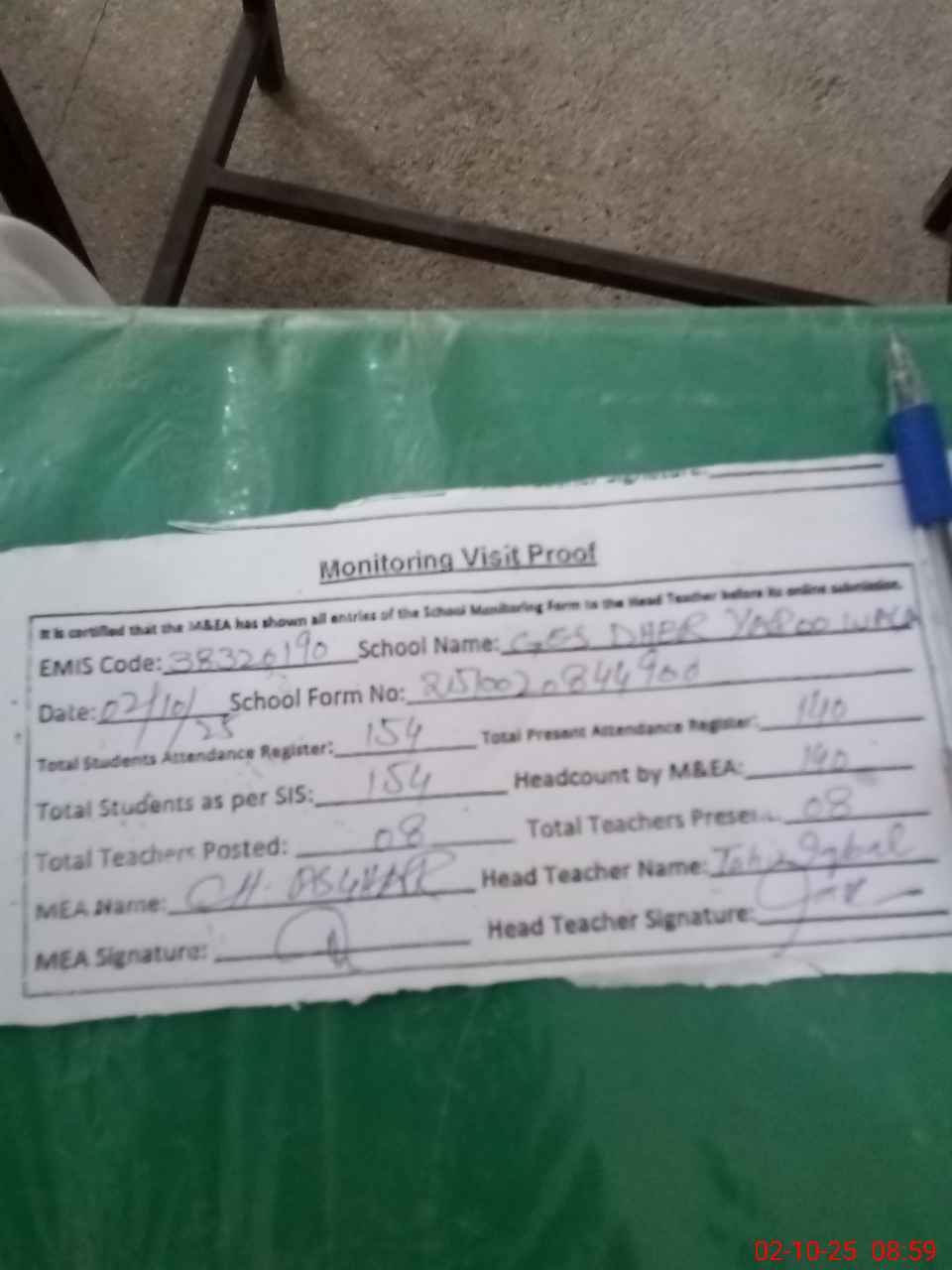 | Attendance Register | Head Teacher | MEA with School | Visit Proof |