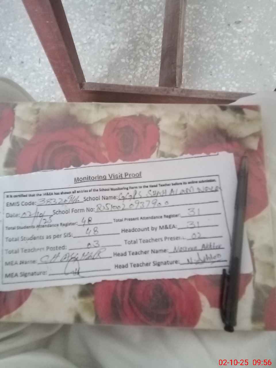 | Attendance Register | Head Teacher | MEA with School | Visit Proof |