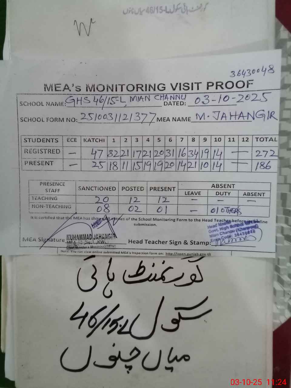 | EMIS Code: 36430048 | Name of School: GHS 46/15-L, MIAN CHANNU | |||