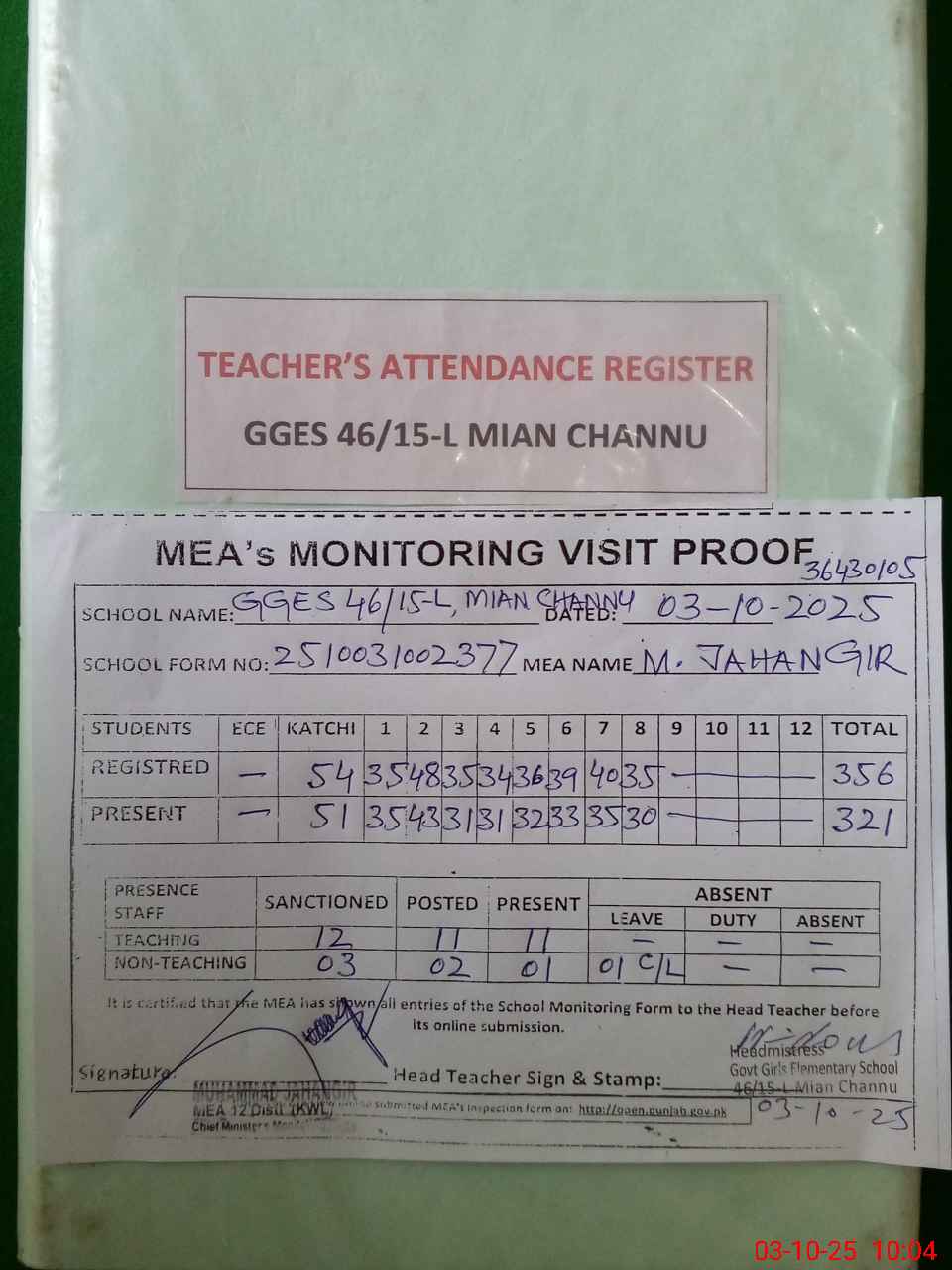 | Attendance Register | Head Teacher | MEA with School | Visit Proof |