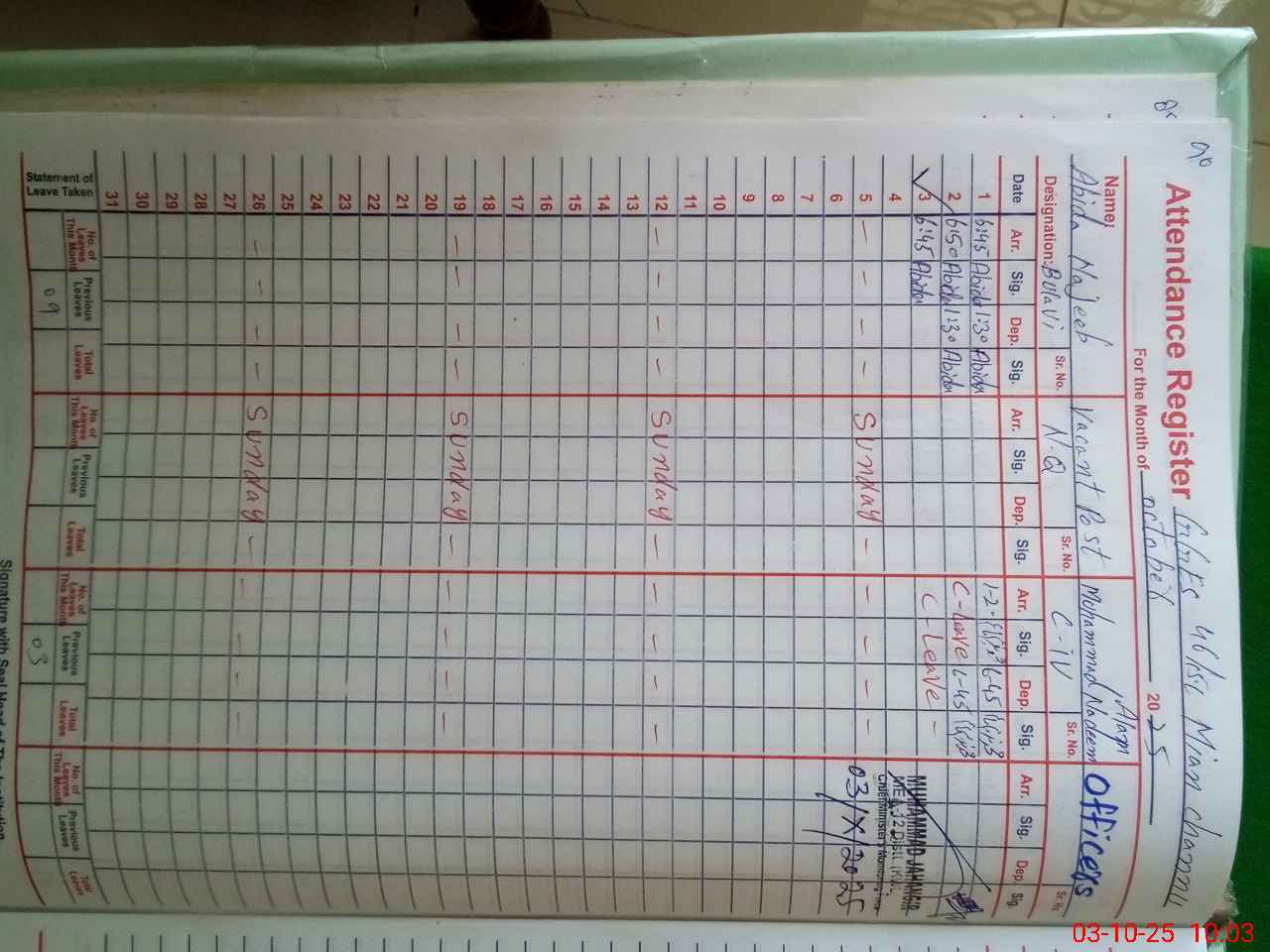 | CNIC | Full Name | Designation | R/C | Absence During Last Calender Month |