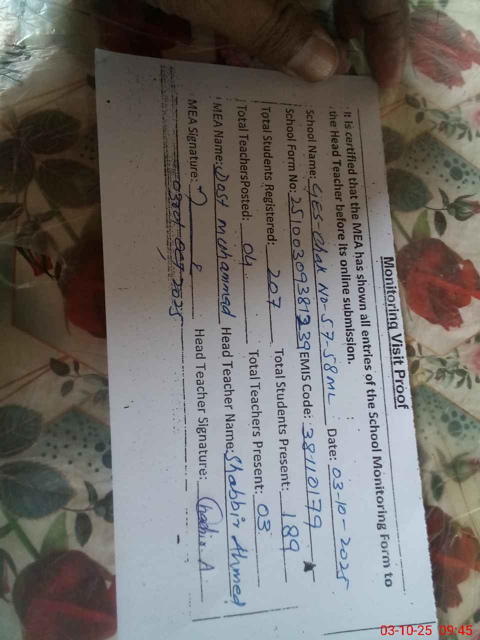 | EMIS Code: 38110179 | Name of School: GPS CHAK NO. 57-58 ML | |||