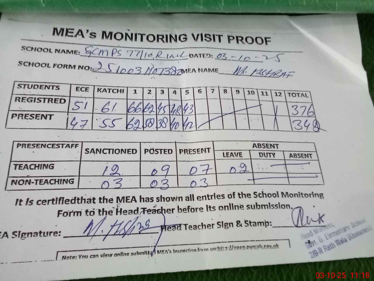 | Attendance Register | Head Teacher | MEA with School | Visit Proof |