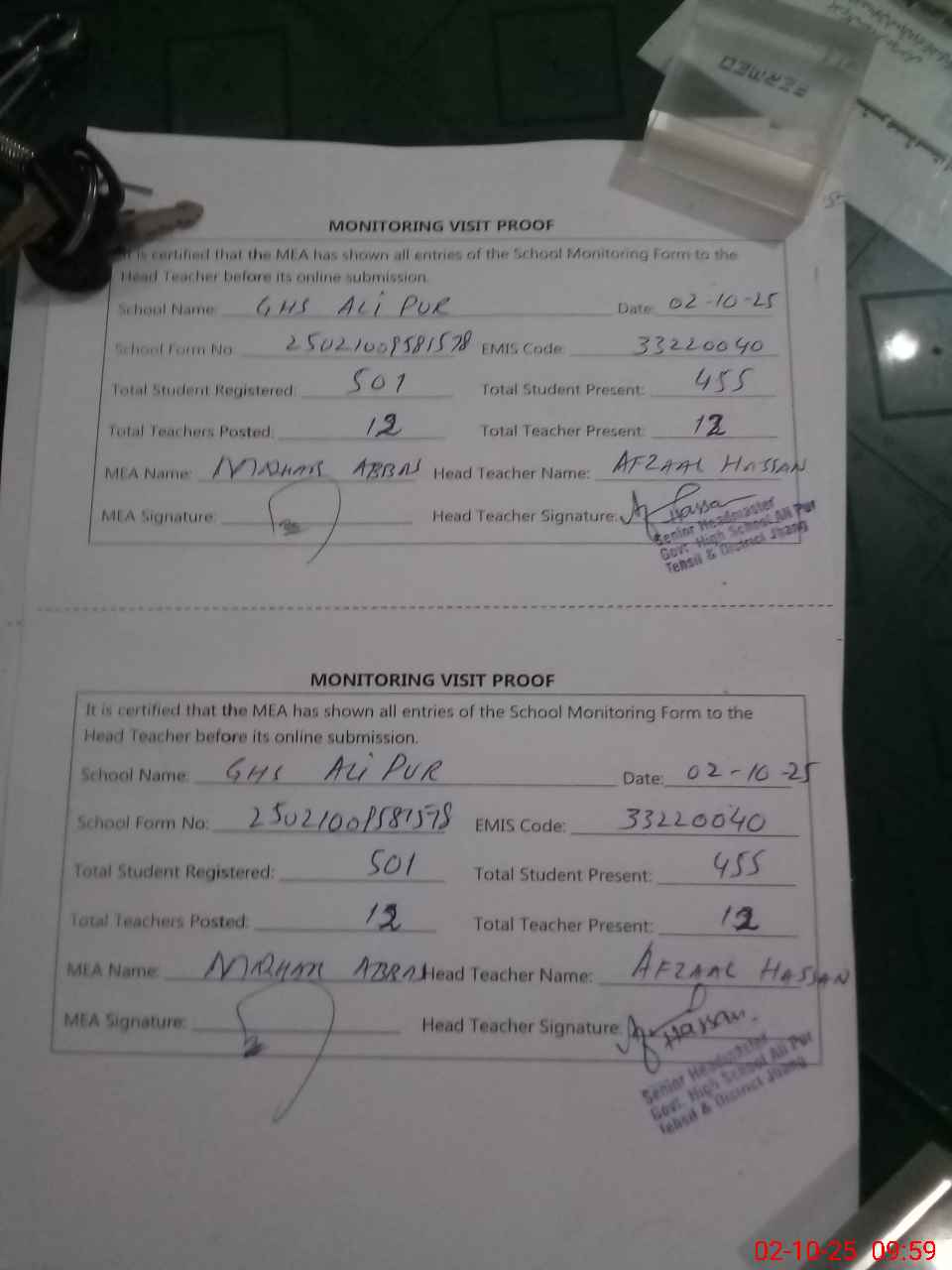 | Attendance Register | Head Teacher | MEA with School | Visit Proof |