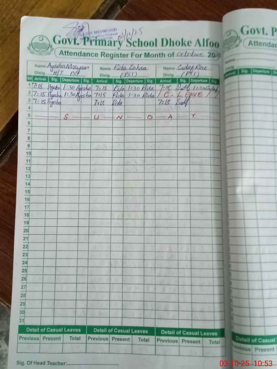 | CNIC | Full Name | Designation | R/C | Absence During Last Calender Month |