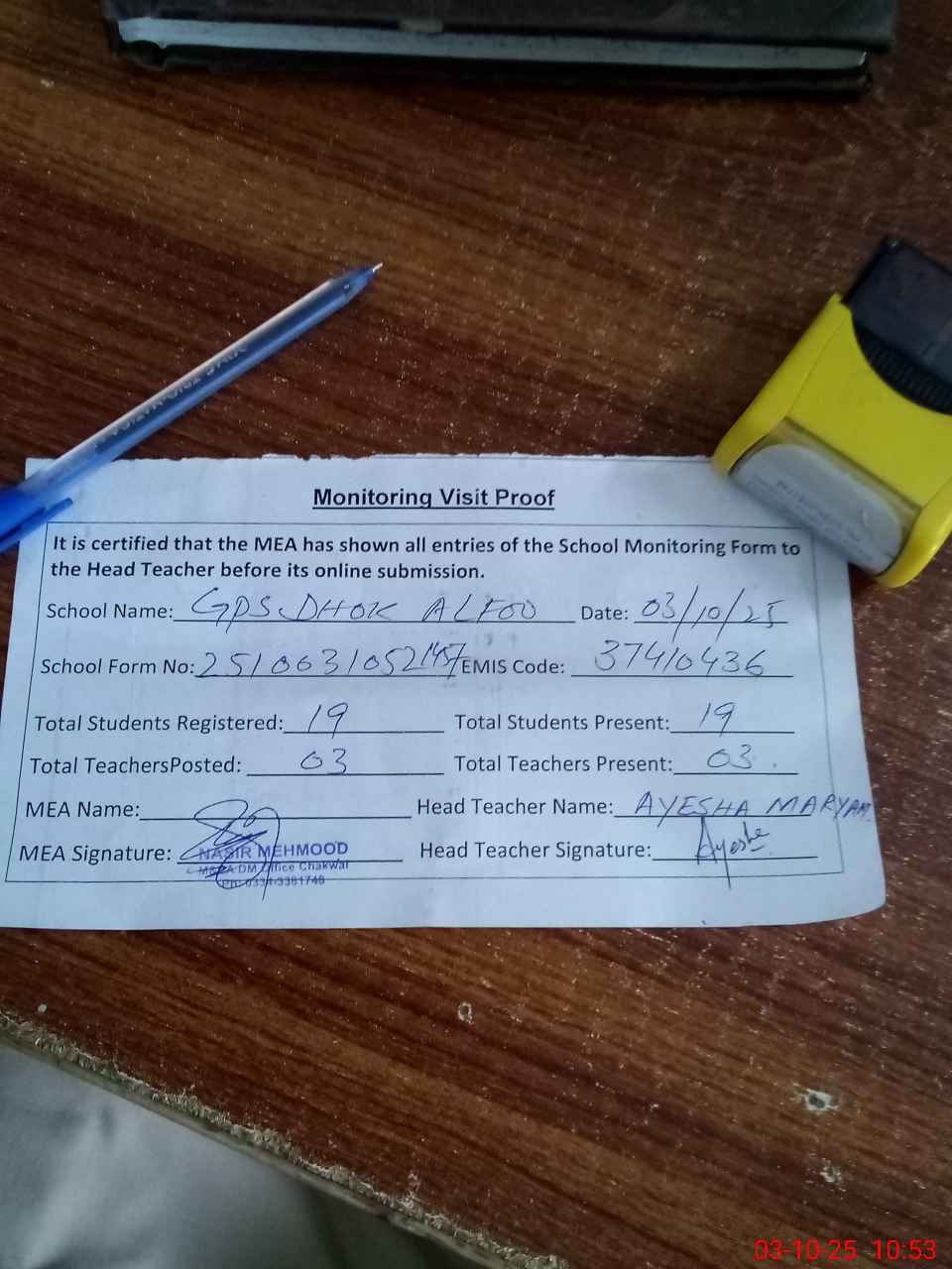 | Certified that this School was Inspected by the Undersigned MEA/DMO Today and the Information Stated Above is as Per Record. | |||||